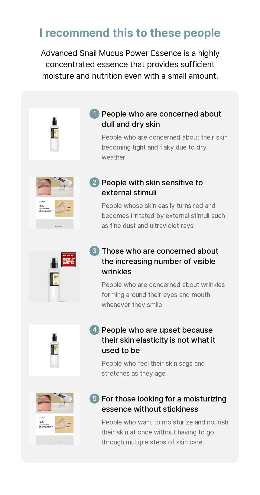 With Snail Secretion Filtrate, It promotes elasticity of skin and